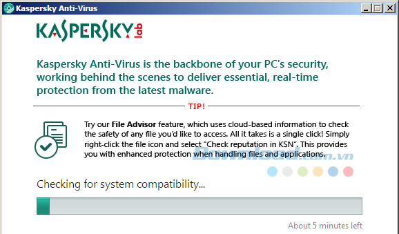 Bước 2: Quá trình cài đặt Kaspersky Anti-Virus bắt đầu. Bạn hãy đợi một lát, quá trình diễn ra nhanh hay chậm còn tùy thuộc vào cấu hình máy tính của bạn.