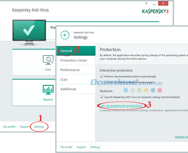 Để người khác không thể thay đổi các thiết lập trên Kaspersky Anti-Virus bạn hãy đặt mật khẩu để bảo vệ chúng bằng cách nhấn vào Settings ở phía dưới cùng trên giao diện chính của chương trình. Sau đó, cửa sổ mới xuất hiện nhấn vào General, rồi nhấn tiếp vào Set up password protection.