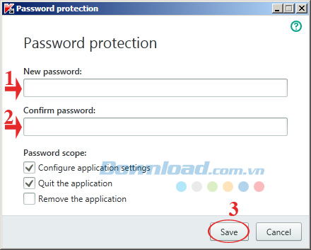 Cửa sổ Password protection xuất hiện, nhập mật khẩu vào ô New password và gõ lại mật khẩu vào ô Confirm password, sau đó nhấn Save để lưu lại mật khẩu.