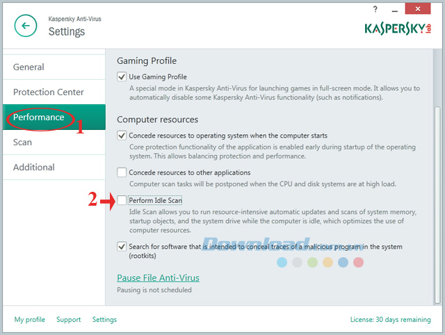 Tùy thuộc vào nhu cầu sử dụng của mỗi người bạn có thể bật hoặc tắt chế độ này. Theo mặc định chế độ Idle Scan đã được kích hoạt sẵn, nếu bạn muốn tắt đi thì trên giao diện Settings nhấn vào thẻ Performance, rồi bỏ tích chọn ở ô Perform Idle Scan.