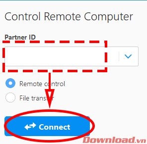 Ở bên phải màn hình chính, ta sẽ thấy phần Control Remote Computer. Đây là phần để bạn nhập mã Partner ID hay mã địa chỉ của máy tính mà bạn muốn điều khiển. Sau khi nhập mã máy, hãy nhấn nút Connect ở phía dưới để tiến hành kết nối.