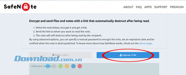 SafeNote cũng vậy, dịch vụ này sẽ giúp bạn hủy file 1 cách tự động sau thời gian cài đặt ban đầu lúc chia sẻ file. Hiện tại SafeNote chỉ hỗ trợ các file chia sẻ dưới 100 MB ở mọi định dạng nên bạn sẽ phải cắt file nếu muốn chia sẻ file có dung lượng lớn. Dưới đây sẽ là cách sử dụng công cụ chia sẻ file tự hủy trực tuyến SafeNote được thực hiện bởi Download.com.vn.