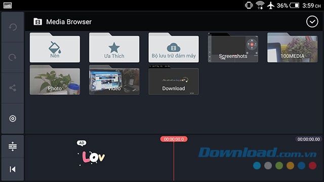 Giao diện làm việc chính của ứng dụng KineMaster xuất hiện, chúng ta sẽ bắt đầu chọn video, ảnh có sẵn tại mục Phương tiện.