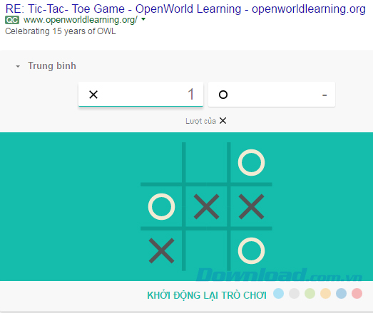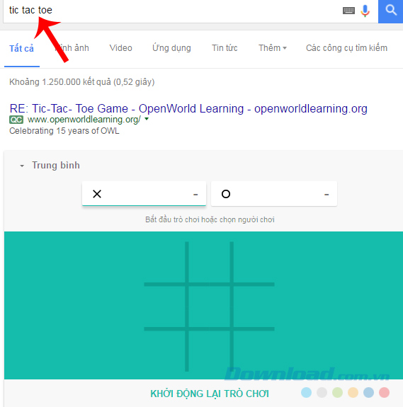 Chỉ cần nhập từ khóa "tic tac toe" vào thanh tìm kiếm và Enter, giao diện chơi cờ sẽ hiện ngay ra ở phần kết quả bên dưới.