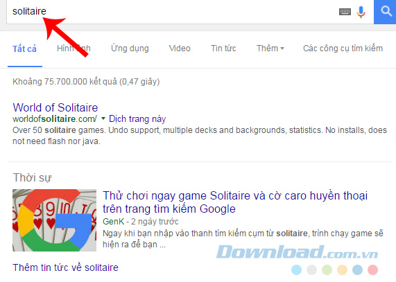 Cũng tương tự như với cờ caro, với từ khóa trực tiếp là tên của game đánh bài Solitaire, chúng ta chọn vào phần hiển thị kết quả đầu tiên để bắt đầu vào chơi.