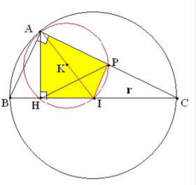 - Xác định tâm K đường tròn ngoại tiếp tứ giác APIH: Điểm P nhìn đoạn thẳng AI dưới một góc vuông nên P thuộc đường tròn đường kính AI. Chứng minh tương tự đối với điểm H. Từ đó xác định được tâm K ( là trung điểm đoạn AI ).
