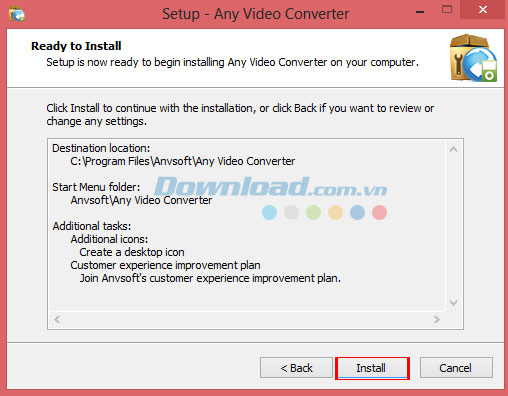 Quá trình cài đặt sẽ bắt đầu ngay lập lức trên máy tính của bạn. Nhấn Install để tiếp tục quá trình hoặc chọn Back nếu muốn xem lại hoặc thay đổi một số thiết lập.