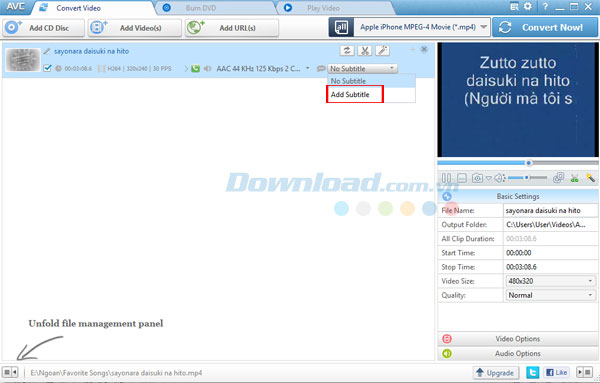 Thêm phụ đề bằng cách nhấp chuột vào nút No Subtitle và chọn Add Subtitle.