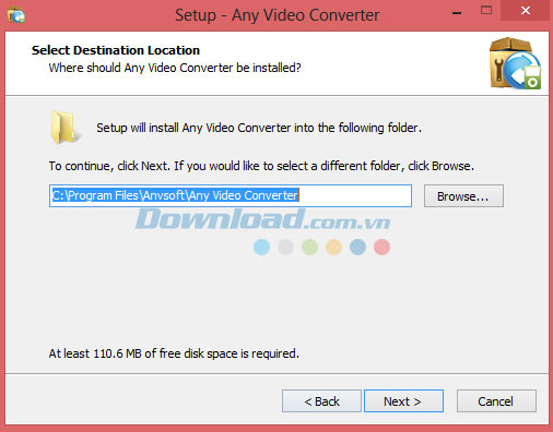Bước sau đó, hãy lựa chọn một vị trí đích để lưu lại file cài đặt Any Video Converter Free. Để tiếp tục, nhấn Next. Nếu muốn chuyển sang một thư mục khác, vui lòng bấm Browse.