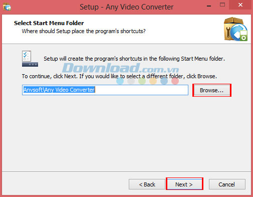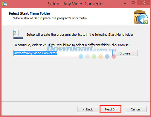 Tiếp đó, chọn thư mục Start Menu để lưu lại các phím tắt sử dụng chương trình. Quá trình cài đặt sẽ tạo ra các phím tắt chương trình trong thư mục Start Menu như bên dưới. Để tiếp tục, nhấn Next. Hoặc, có thể lựa chọn một thư mục khác bằng cách nhấn nút Browse.