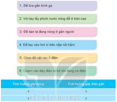 Em hãy lựa chọn và sắp xếp các thẻ tình huống có thể gây bỏng, hoặc gây điện giật để hoàn thiện bảng theo mẫu gợi ý dưới đây