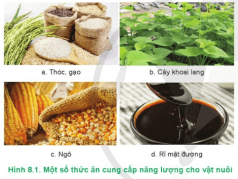 Luyện tập 1: Các loại thức ăn cung cấp năng lượng trong hình 8.1 được sử dụng cho loại vật nuôi nào?