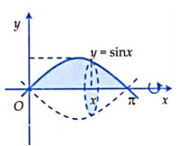 Tính thể tích của khối tròn xoay thu được khi quay hình phẳng được giới hạn bởi đường cong y = sinx, trục hoành và hai đường thẳng x=0, x=π (hình vẽ) quanh trục Ox.