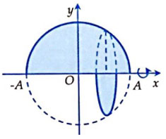 Do \sqrt{A^2-x^2}\ge\ 0\(\sqrt{A^2-x^2}\ge\ 0\) với mọi x, do vậy đây là phương trình nửa đường tròn tâm O, bán kính R = A nằm phía trên trục Ox. Khi quay quanh trục Ox thì hình phẳng sẽ tạo nên một khối cầu tâm O, bán kính R = A (hình vẽ). Do vậy ta có luôn