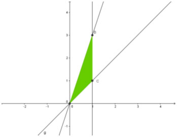 Tọa độ giao điểm của đường x = 1 với y = x và y = 3x là các điểm C(1;1) và B(3;1). Tọa độ giao điểm của đường y = 3x với y = x là O(0;0).