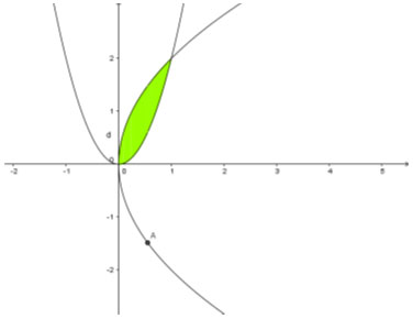 Với x\in[0;2]\(x\in[0;2]\) thì y^2=4x\(y^2=4x\) tương đương y=2\sqrt{x}\(y=2\sqrt{x}\). Tọa độ giao điểm của đường \mathrm{y}=2 \mathrm{x}^2\(\mathrm{y}=2 \mathrm{x}^2\) với \mathrm{y}^2=4 \mathrm{x}\(\mathrm{y}^2=4 \mathrm{x}\) là các điểm O(0;0) và A(1;2).