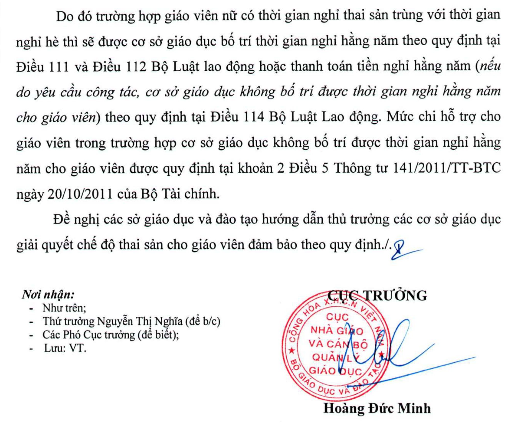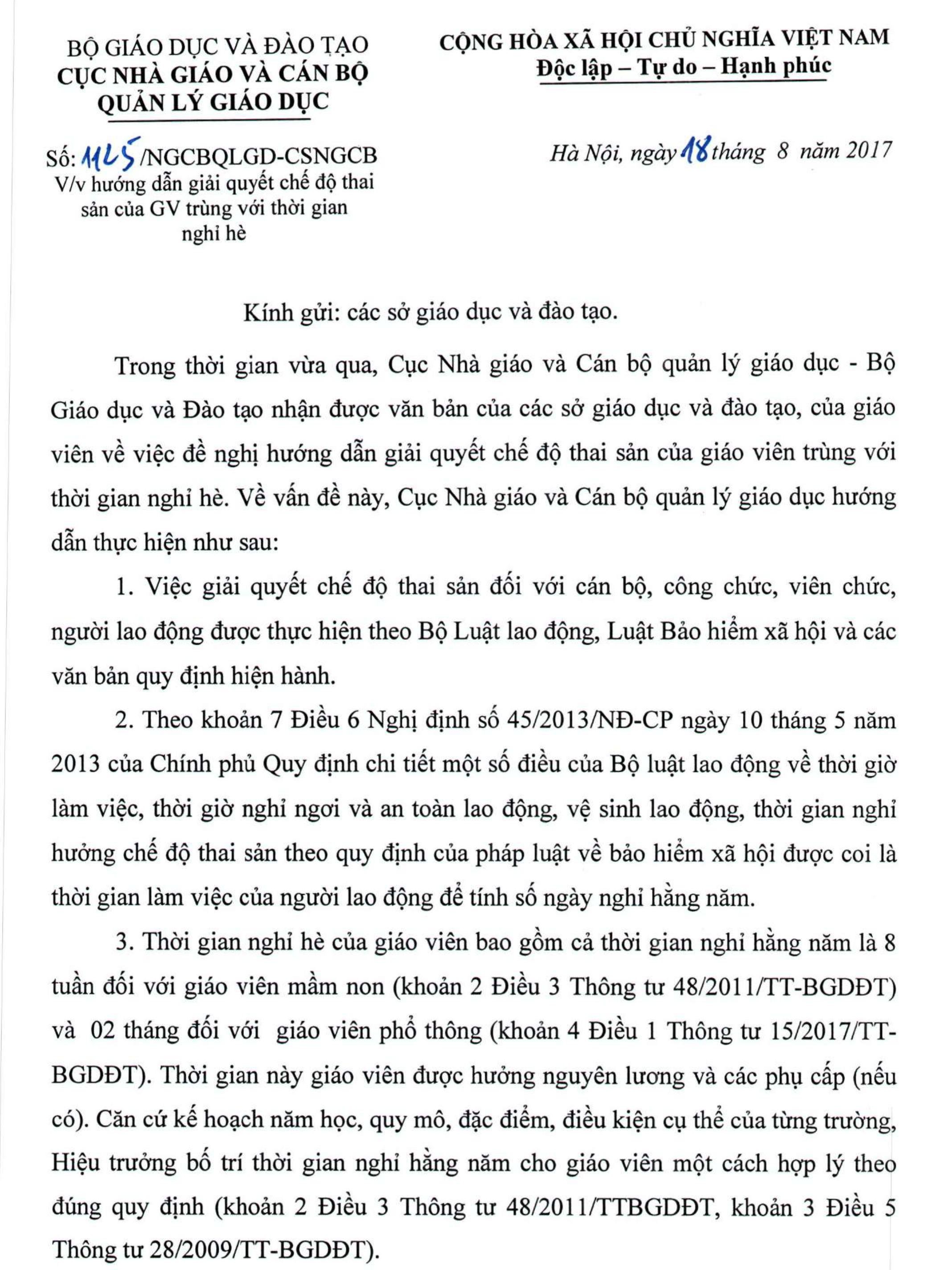 Tìm hiểu thêm »Cục Nhà giáo và Cán bộ quản lý giáo dục đã ban hành Công văn 1125/NGCBQLGD-CSNGCB ngày 18/08/2017 về việc hướng dẫn giải quyết chế độ thai sản của giáo viên trùng với thời gian nghỉ hè. Theo đó, trường hợp viên chức giáo viên nữ có thời gian nghỉ thai sản trùng với thời gian nghỉ hè (tháng 6 và tháng 7) thì sẽ được cơ sở giáo dục bố trí tiếp thời gian nghỉ hè theo quy định tại điểm a, khoản 3, điều 5 quy định chế độ làm việc đối với giáo viên phổ thông hoặc thanh toán tiền nghỉ phép hàng năm (nếu không bố trí được thời gian nghỉ hè cho giáo viên). Mời các bạn cùng tham khảo nội dung chi tiết tại đây.