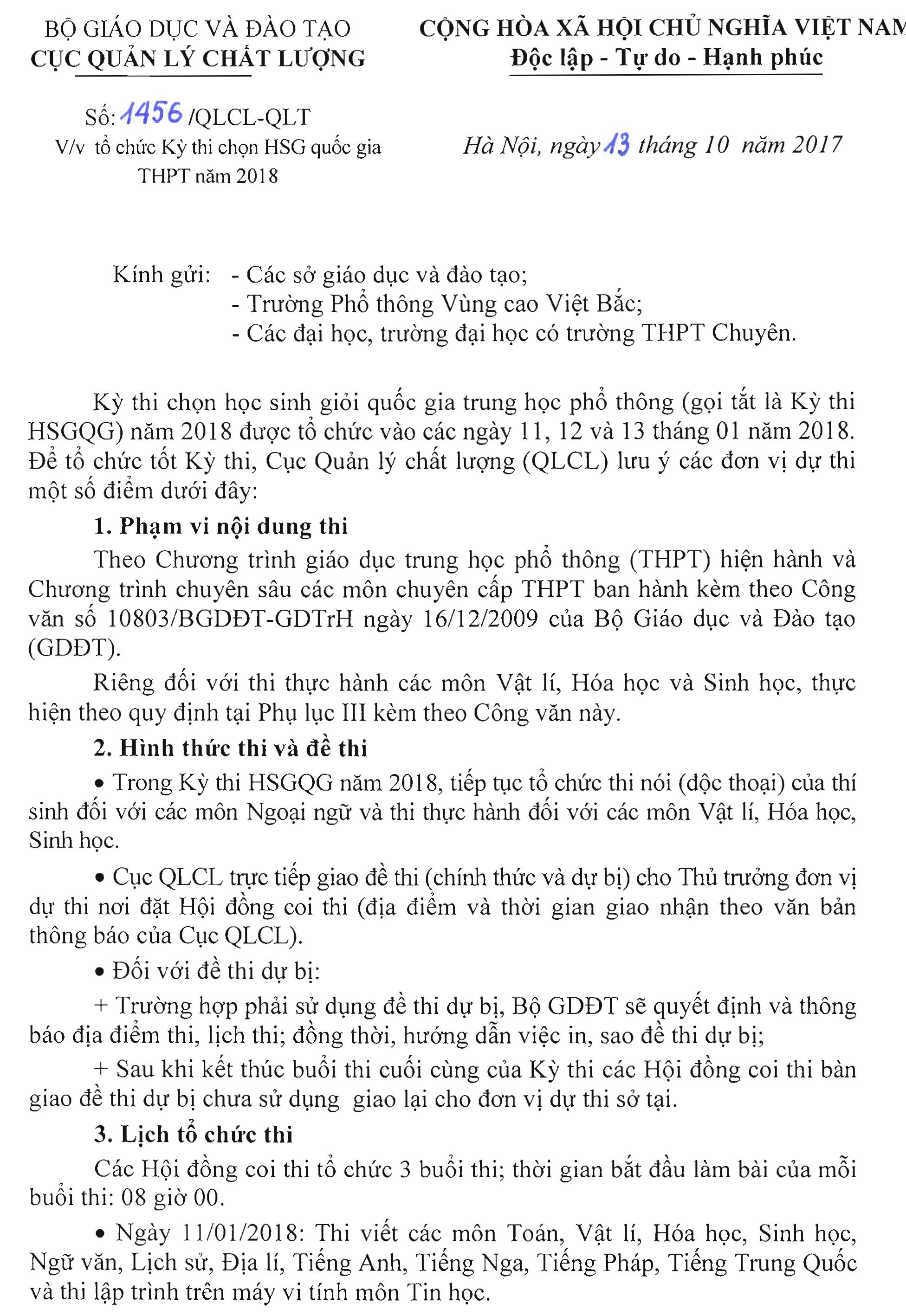 Công văn 1456/QLCL-QLT Lịch thi học sinh giỏi quốc gia THPT năm 2018