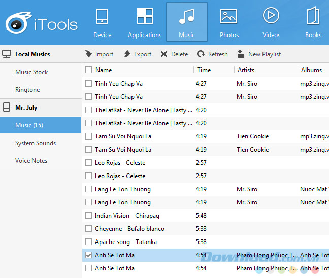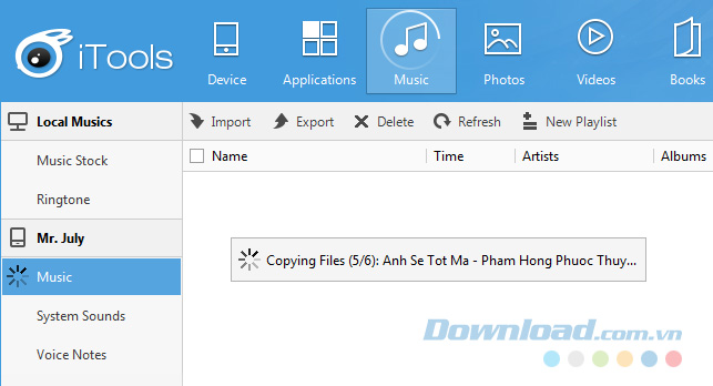 Bước 5: Cũng tương tự như khi chúng ta copy video vào iPhone bằng iTools mà Download.vn đã nói trước đây. Các bạn cũng có thể sử dụng thao tác kéo thả hoặc truy cập thẳng vào vị trí lưu những file nhạc này và sử dụng.
