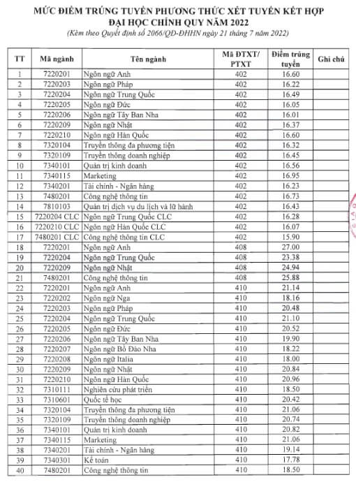Điểm chuẩn xét tuyển kết hợp Trường Đại học Hà Nội năm 2022