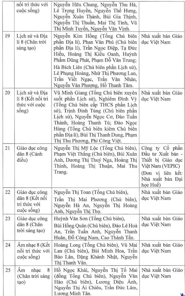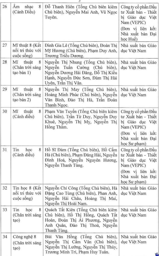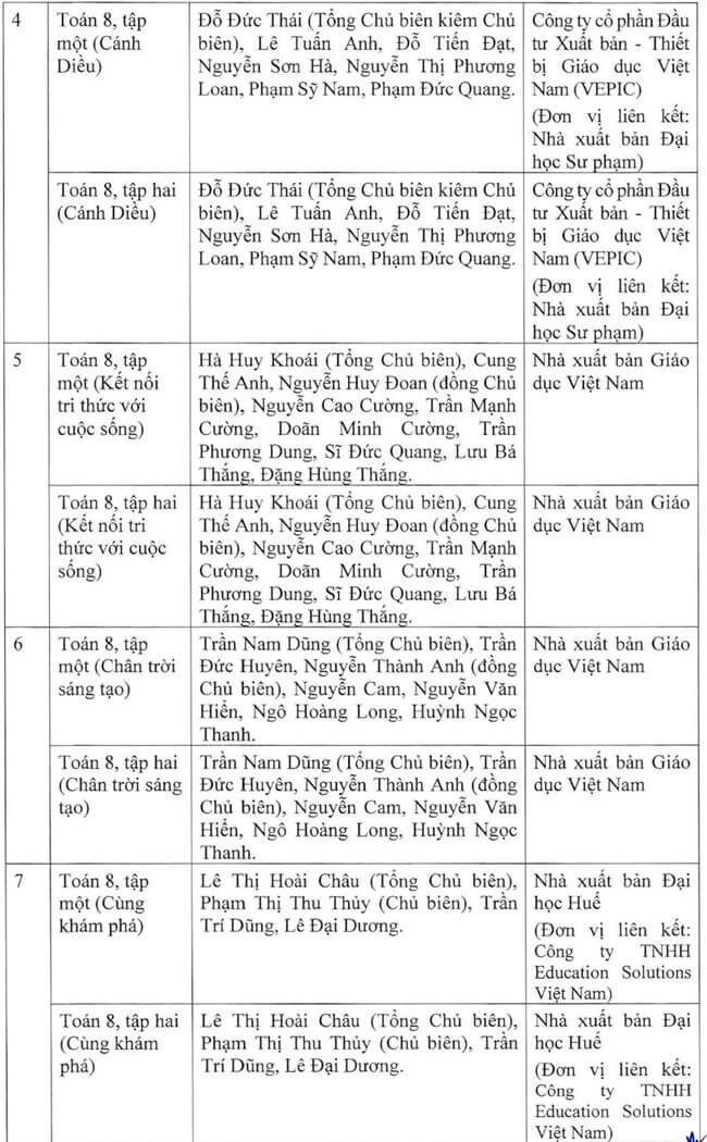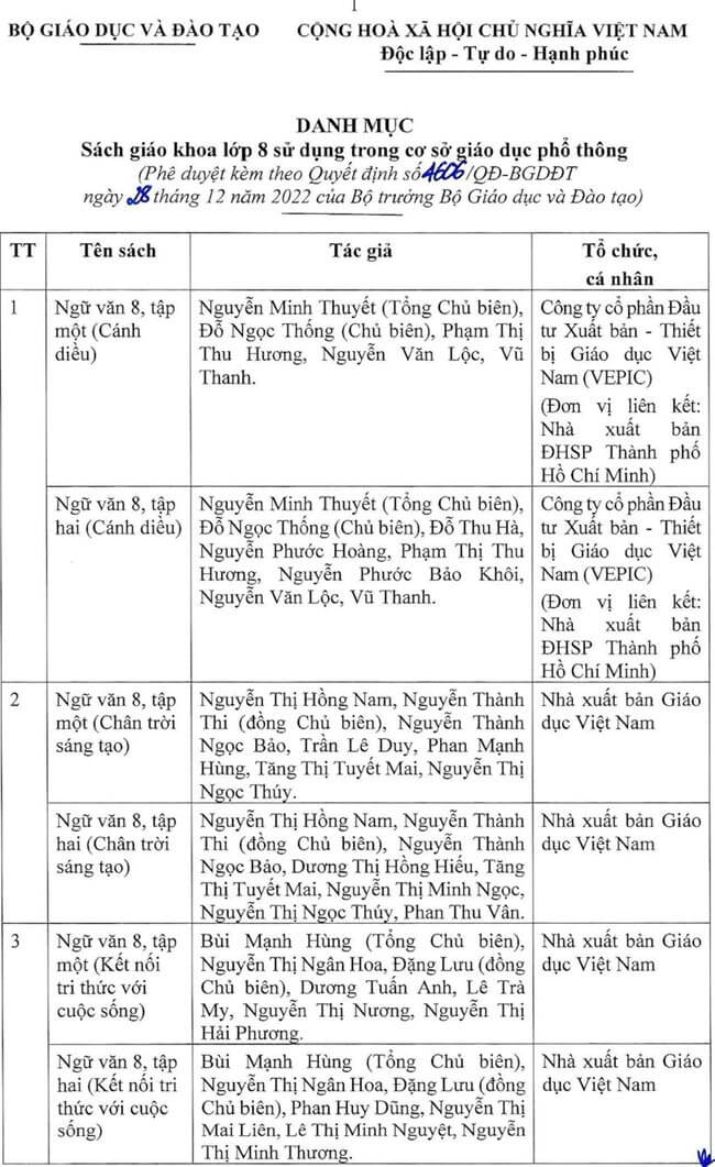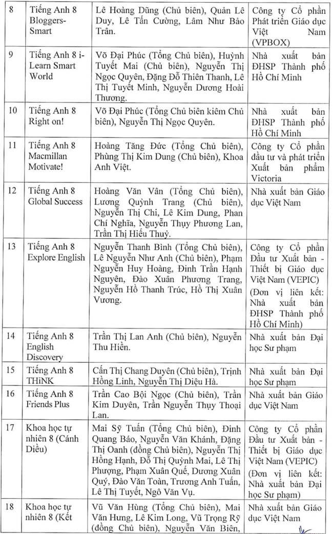 Danh sách 42 đầu sách thuộc danh mục sách giáo khoa lớp 8 đã được phê duyệt như sau: