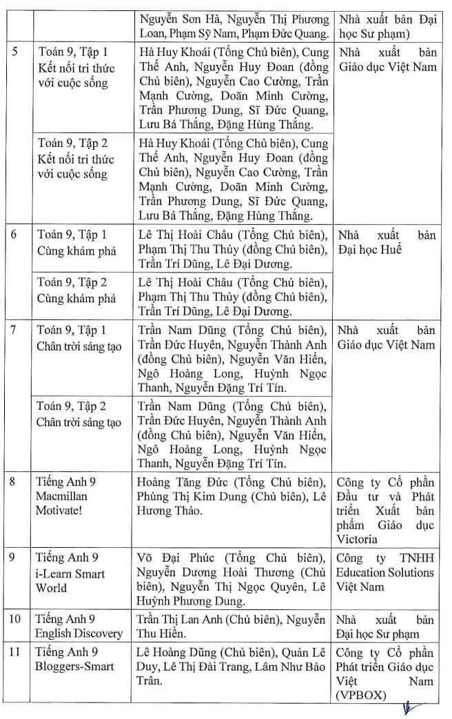 Theo lộ trình, đến năm học 2024 - 2025, học sinh lớp 9 sẽ được triển khai Chương trình Giáo dục phổ thông mới. Các địa phương tổ chức lựa chọn sách giáo khoa căn cứ theo danh mục sách giáo khoa đã được phê duyệt. Danh mục gồm 48 đầu sách giáo khoa của các môn học, hoạt động giáo dục dành cho học sinh lớp 9 sẽ được sử dụng trong các cơ sở giáo dục phổ thông từ năm học tới. Vậy sau đây là trọn bộ danh mục SGK lớp 9 năm 2024 - 2025 mời các bạn cùng theo dõi tại đây.