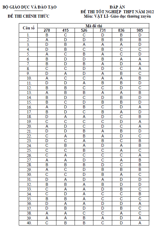 Tìm hiểu thêm »Đáp án đề thi tốt nghiệp THPT môn Vật lí dưới hình thức trắc nghiệm dành cho hệ Giáo dục thường xuyên năm học 2012