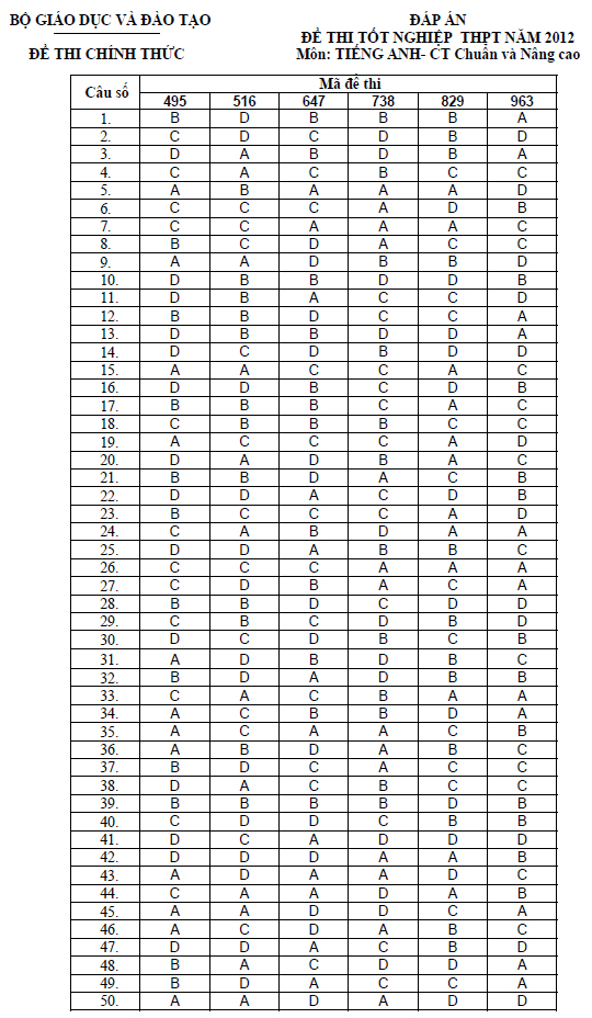 Tìm hiểu thêm »Đáp án đề thi tốt nghiệp THPT môn tiếng Anh dành cho hệ chương trình chuẩn và nâng cao năm học 2012