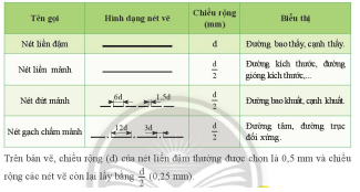 + Đường nét: nét liền đậm, nét liền mảnh, nét đứt mảnh, nét gạch chấm mảnh.