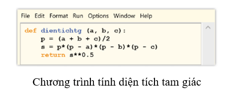Câu 3. Chương trình ở hình sau xây dựng một hàm tính diện tích một tam giác bằng công thức Heron theo ba cạnh của tam giác. Em hãy hoàn thiện chương trình bằng lời gọi hàm thích hợp để đưa ra màn hình kết quả tính diện tích của tam giác có ba cạnh là 3, 4, 5.