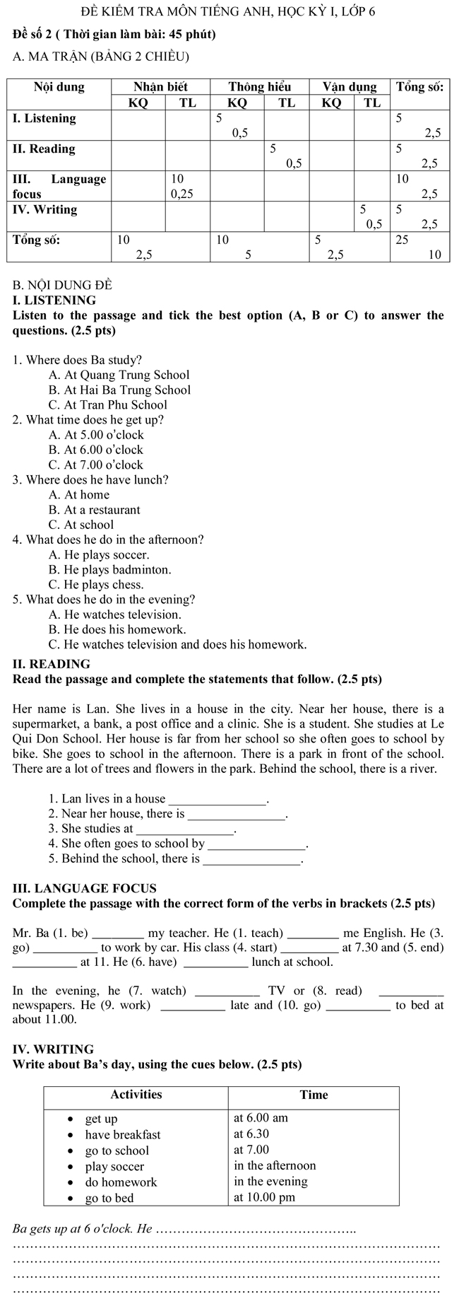 Đề kiểm tra học kì I lớp 6 môn tiếng Anh - Đề số 2 Đề kiểm tra tiếng Anh