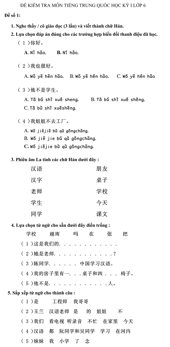 Tìm hiểu thêm »Đề kiểm tra học kì I môn tiếng Trung Quốc dành cho học sinh THCS lớp 6 - Đề số 1