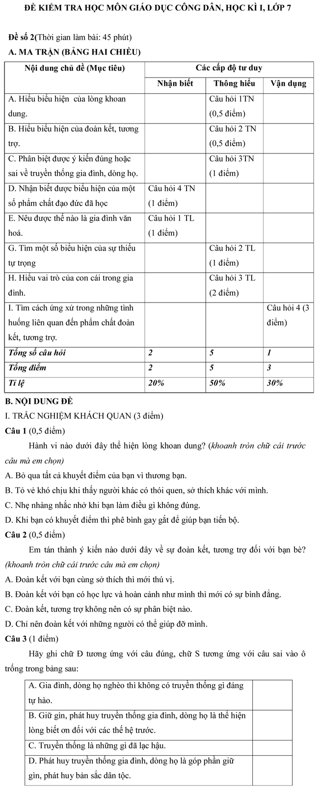 Tìm hiểu thêm »Đề kiểm tra học kì I môn Giáo dục công dân dành cho học sinh THCS lớp 7 - Đề số 2