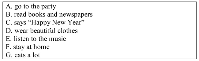 Jack’s birthday is on December 31st. He always has a big party at his house. All of the guests (1) ________. Jack prepares delicious food and everyone (2) __________ and drinks a lot of champagne. Jack’s parents don’t (3) __________. They celebrate New Year’s Eve at home.