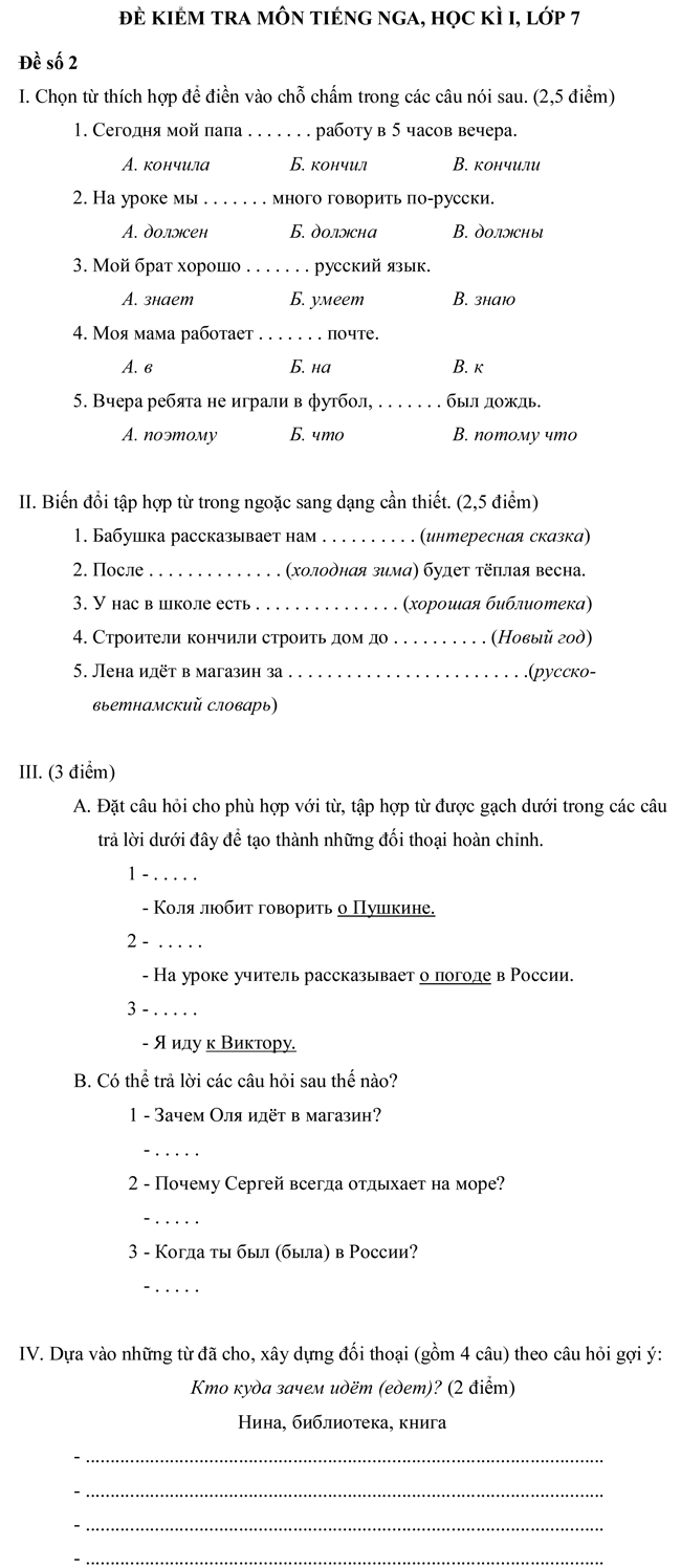 Tìm hiểu thêm »Đề kiểm tra học kì I môn tiếng Nga dành cho học sinh THCS lớp 7 - Đề số 2