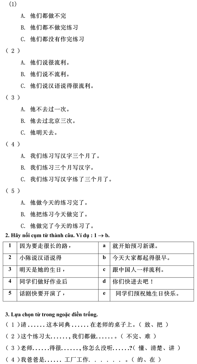 1. Nghe thầy/ cô giáo đọc (mỗi câu 2 lần) và lựa chọn đáp án đúng.