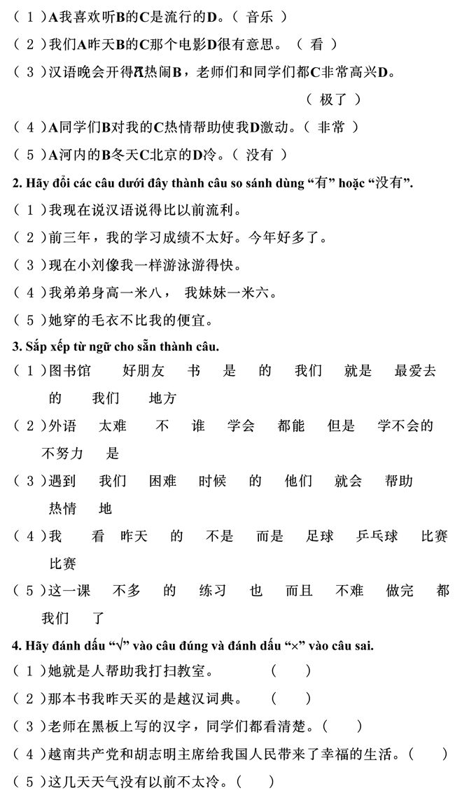1. Hãy khoanh tròn vào chữ cái chỉ rõ vị trí duy nhất đúng trong câu của từ trong ngoặc đơn.
