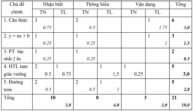 Chữ số phía trên, bên trái mỗi ô là số lượng câu hỏi; chữ số ở góc phải dưới mỗi ô là trọng số điểm cho các câu ở ô đó