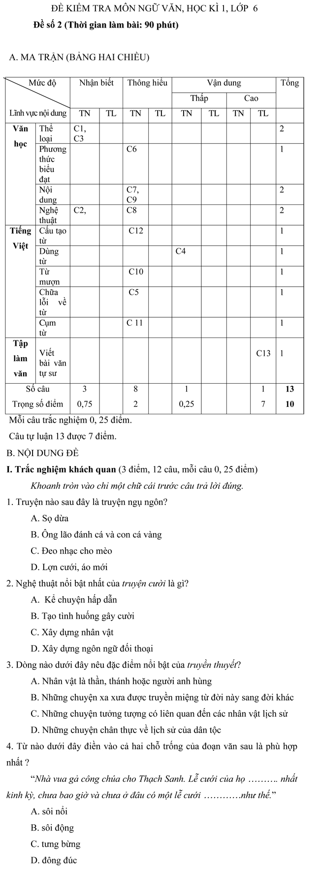 Tìm hiểu thêm »Đề kiểm tra học kì I môn Ngữ văn dành cho học sinh THCS lớp 6 - Đề số 2