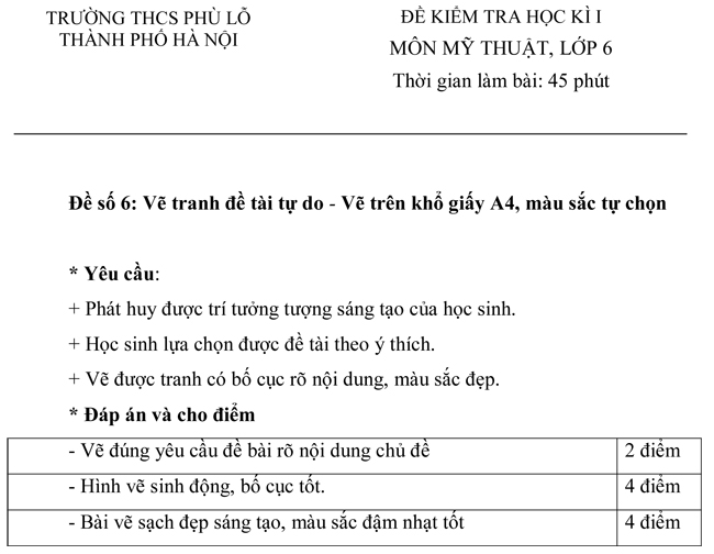 Đề kiểm tra học kì I trường THCS Phù Lỗ môn Mỹ thuật lớp 6 - Đề số 6 Đề kiểm tra Mỹ Thuật