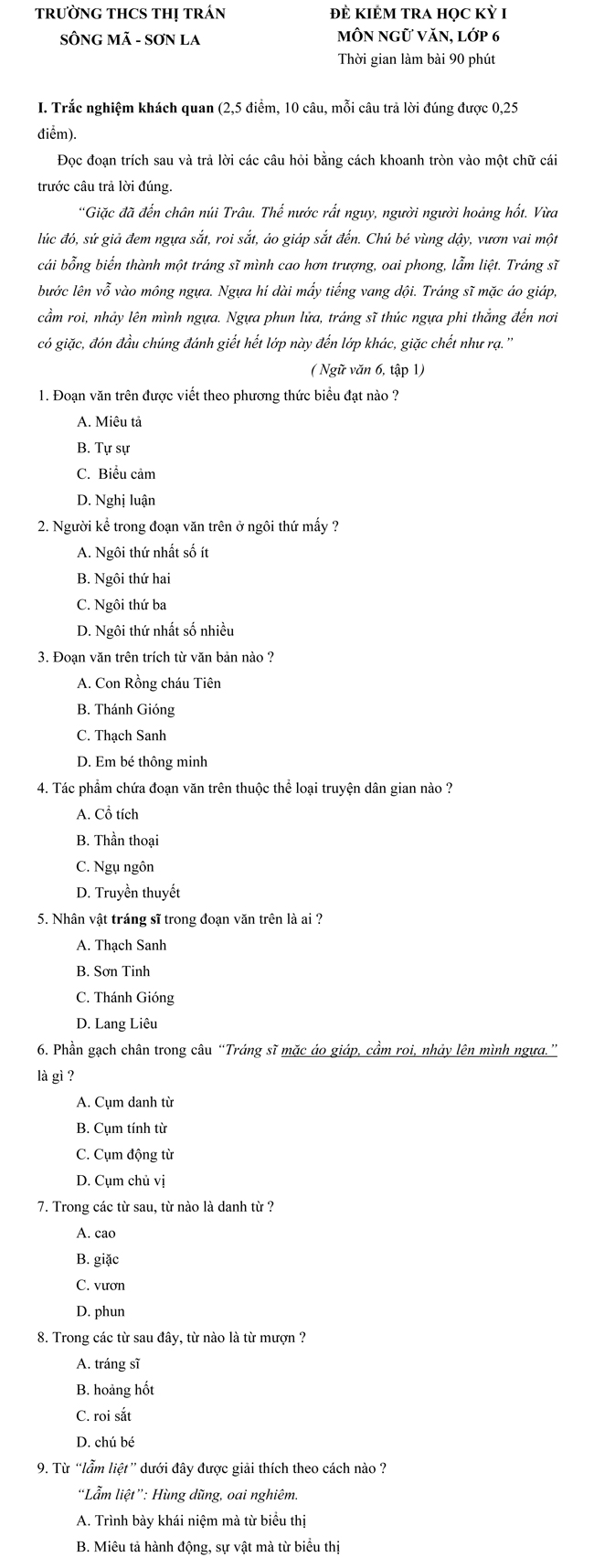 Đề kiểm tra học kì I trường THCS Thị Trấn, Sông Mã - Sơn La môn Ngữ văn lớp 6