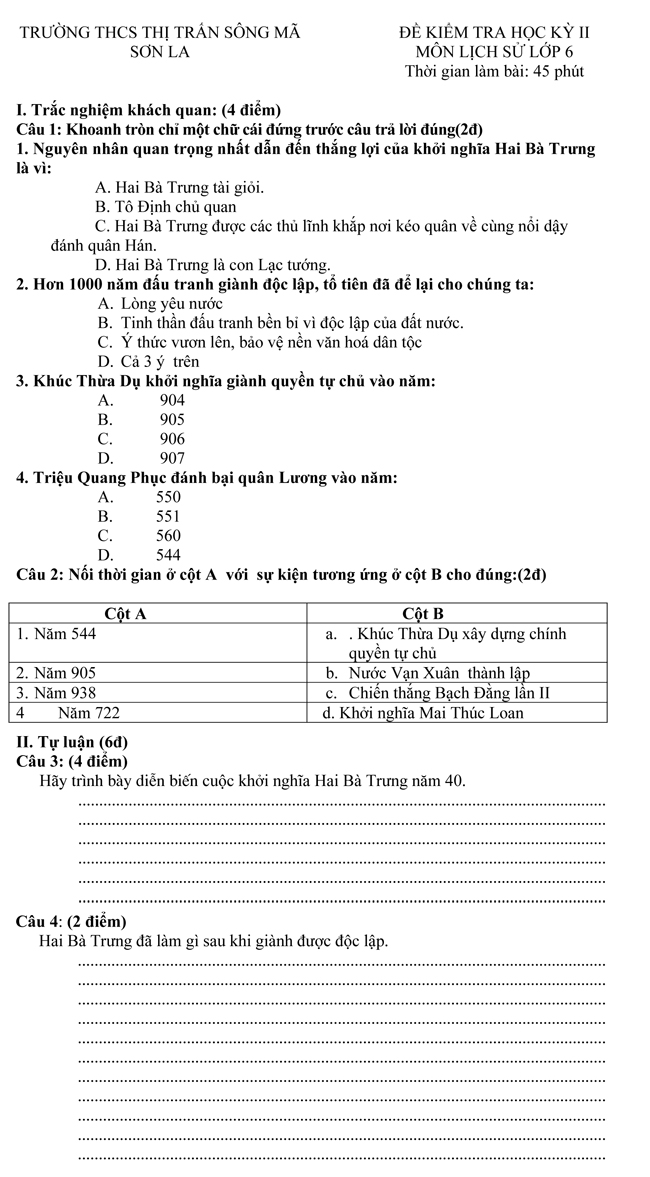 Tìm hiểu thêm »Đề kiểm tra học kì II môn Lịch sử lớp 6 của trường THCS Thị Trấn Sông Mã - Sơn La (đề 2)