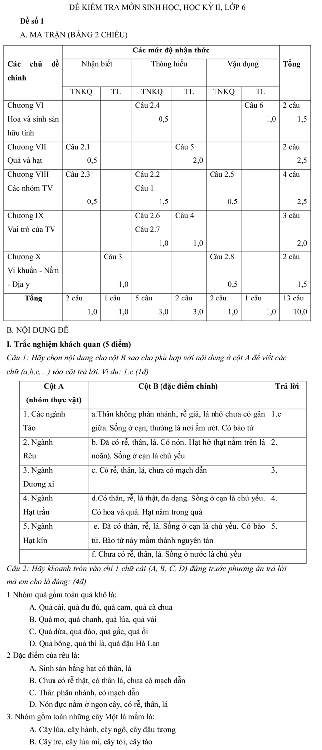 Tìm hiểu thêm »Đề kiểm tra học kì II môn Sinh học dành cho học sinh lớp 6 - Đề số 1