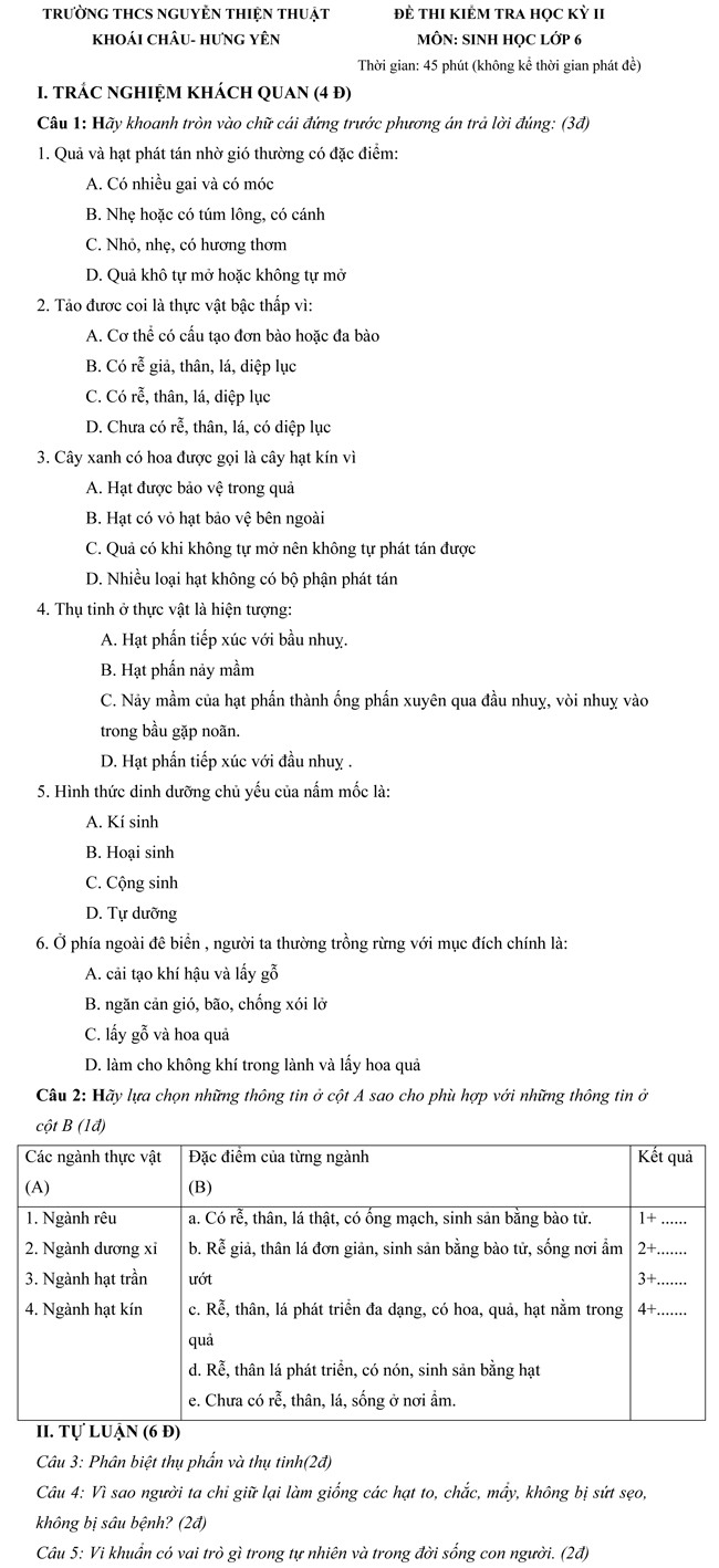 Đề kiểm tra học kì II lớp 6 môn Sinh học trường THCS Nguyễn Thiện Thuật, Khoái Châu - Hưng Yên