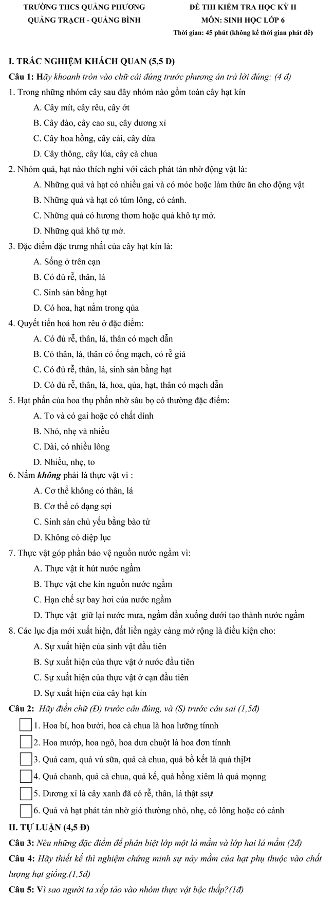 Tìm hiểu thêm »Đề kiểm tra học kì II lớp 6 môn Sinh học trường THCS Quảng Phương, Quảng Trạch - Quảng Bình