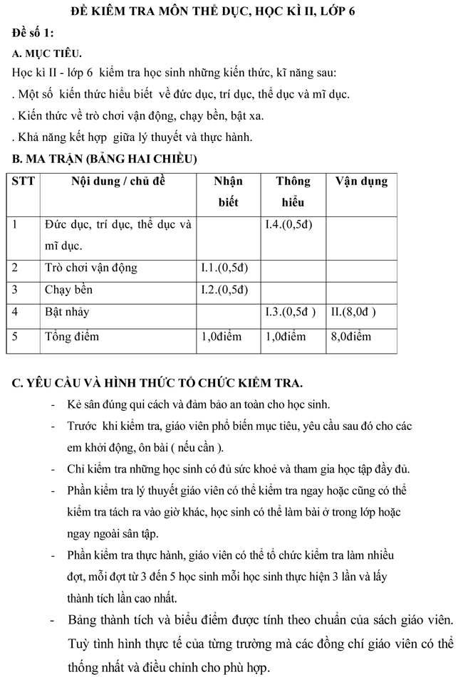 Đề kiểm tra học kì II lớp 6 môn Thể dục - Đề số 1 Đề kiểm tra Thể dục
