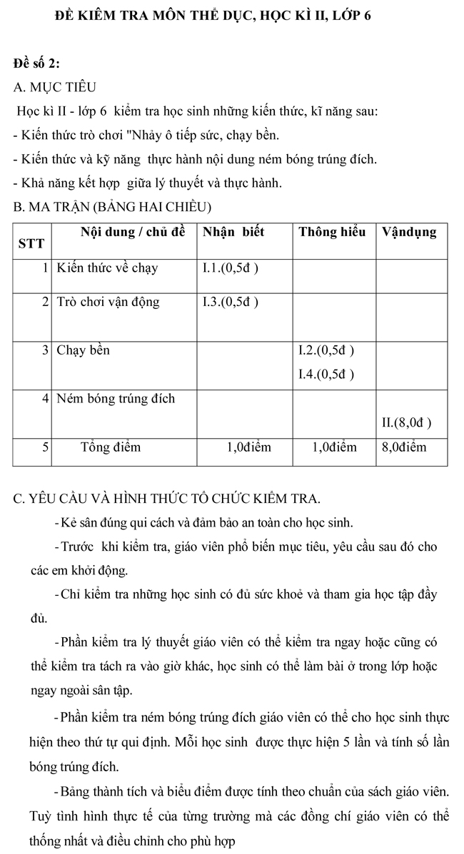 Đề kiểm tra học kì II lớp 6 môn Thể dục - Đề số 2 Đề kiểm tra Thể dục