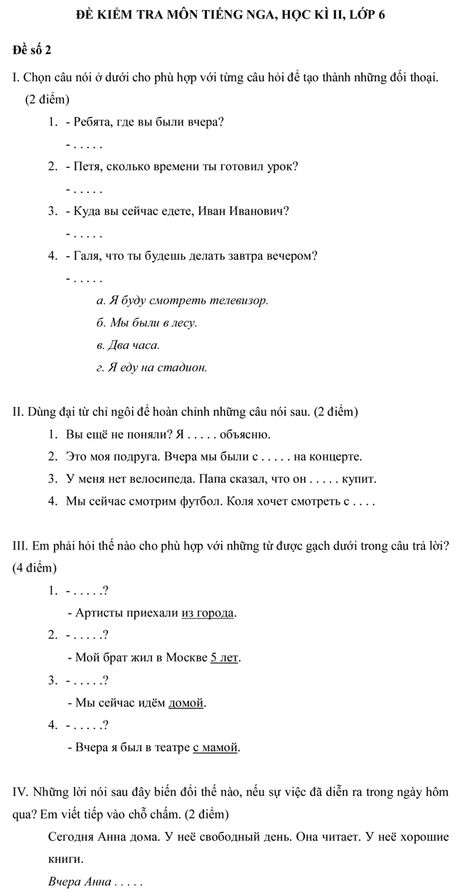 Đề kiểm tra học kì II dành cho học sinh THCS lớp 6 môn tiếng Nga - Đề số 2