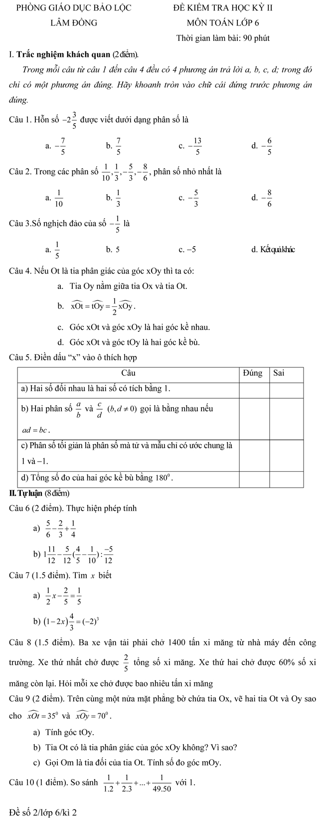 Đề kiểm tra học kì II lớp 6 môn Toán - Phòng Giáo dục Bảo Lộc, Lâm Đồng (Đề 2) Đề kiểm tra môn Toán