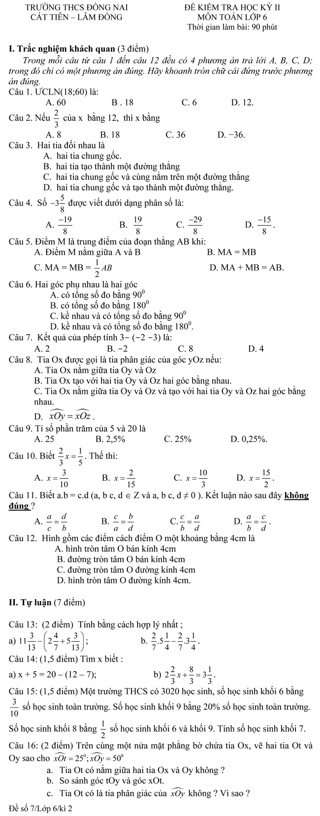 Tìm hiểu thêm »Đề kiểm tra học kì II môn Toán dành cho học sinh THCS lớp 6 (Đề 7) - Trường THCS Đồng Nai, Cát Tiên, Lâm Đồng